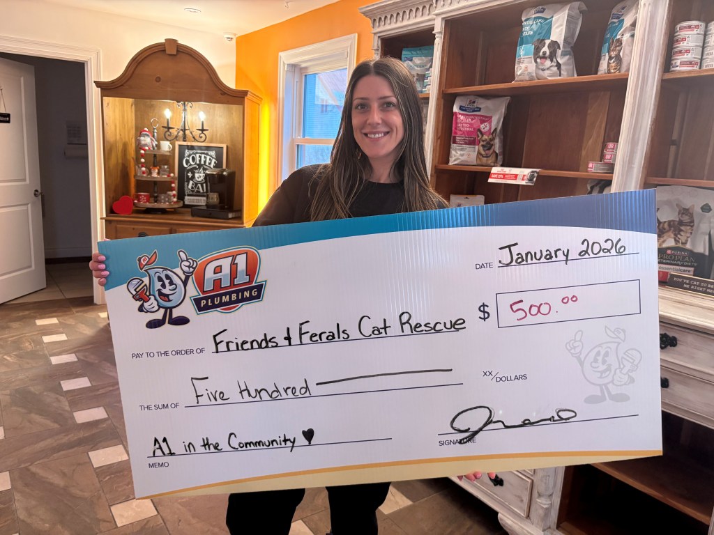A huge, heartfelt THANK YOU to A1 Plumbing for choosing to support local charities and small organizations like ours. This $500 donation is not “just” $500 — it’s vaccines, spays and neuters, food, and real second chances for cats who need us.