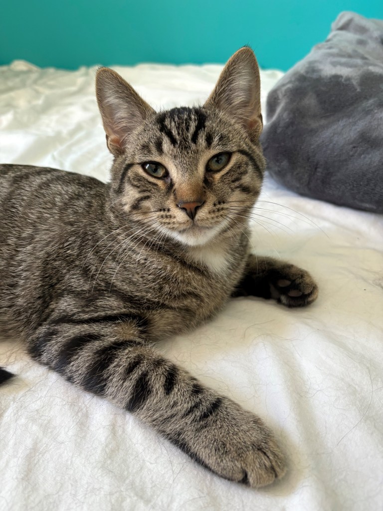 Likes: Sleeping with you at night, snuggles, plastic spring toys, playing/sleeping on the cat tree, watching out the windows. Any kind of treats.