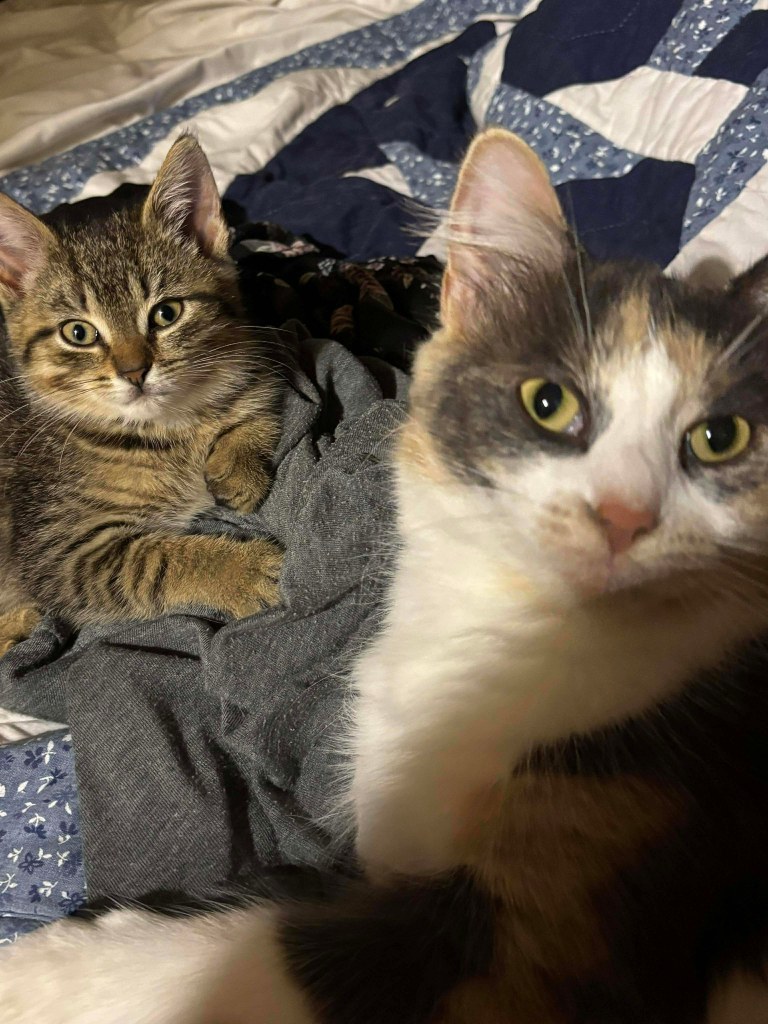Little Lumi was rescued in the moonlight in Tweed. She is the sweetest little thing and has helped Charlotte recover from the loss of her babies and is showing her how to be a kitten herself.