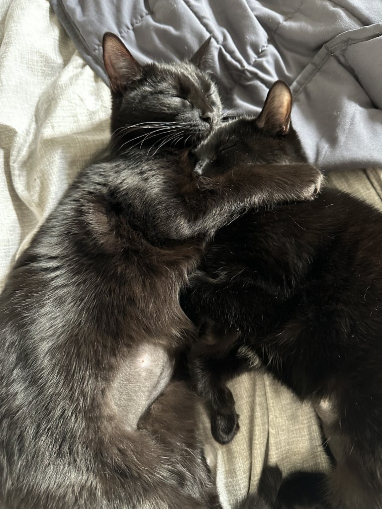 These two sweet girls were born into foster care along with 3 other siblings, who have long since been adopted (mama too). Mama Andee came from a farm outside the Madoc/Tweed area and was very pregnant when we took her in. We gave her a safe space to have her babies and eventually recover from her spay when the time came. She was adopted months ago with two of her babies, leaving Mikey and Wheezy still in foster care. These sisters are now very bonded and do absolutely everything together. They sleep, eat, and play together. Their adoption fee has generously been covered by a kind sponsor, in hopes of encouraging an adoption. It’s such a shame black cats are so overlooked, because these sisters are SO ready for their forever home. They just need someone to give them a chance.