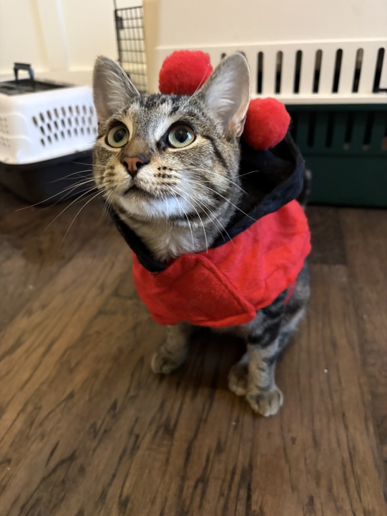 Likes: Any and all treats. Springs and catnip toys. The cat tree and window watching. Being cuddled and picked up